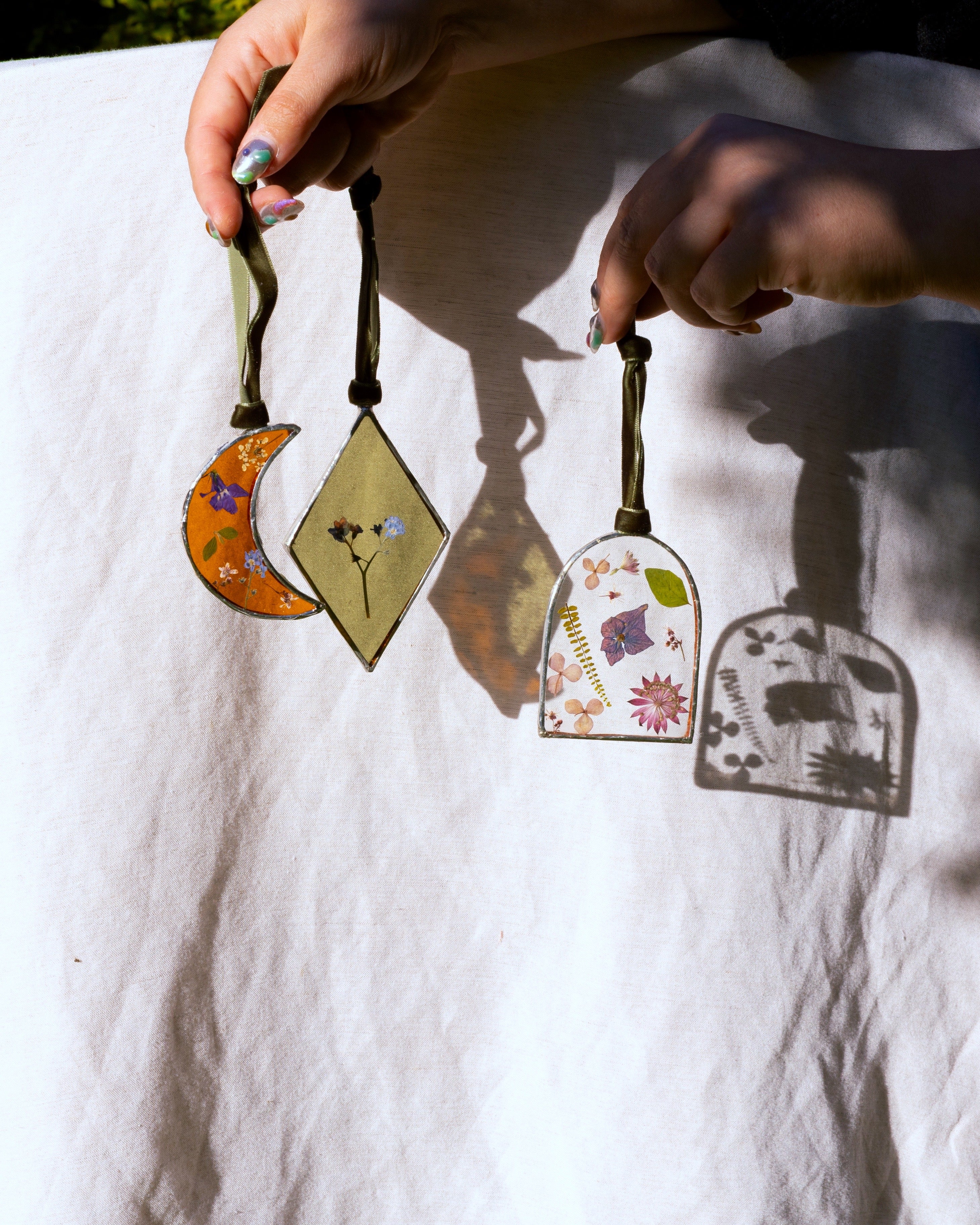 Celestial Stained Glass Mobile Moon/ Cloud/ Star with Pressed Pansy Flowers(2-3 weeks)