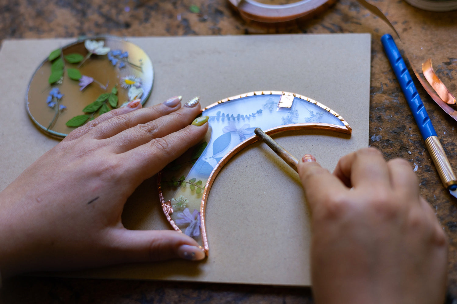 Since 2019 I have been experimenting with stained glass and pressing flowers. My journey started in Bristol and now I am based in Devon. I use traditional Tiffany Stained Glass techniques when creating my pieces with all my flowers being collected locally.