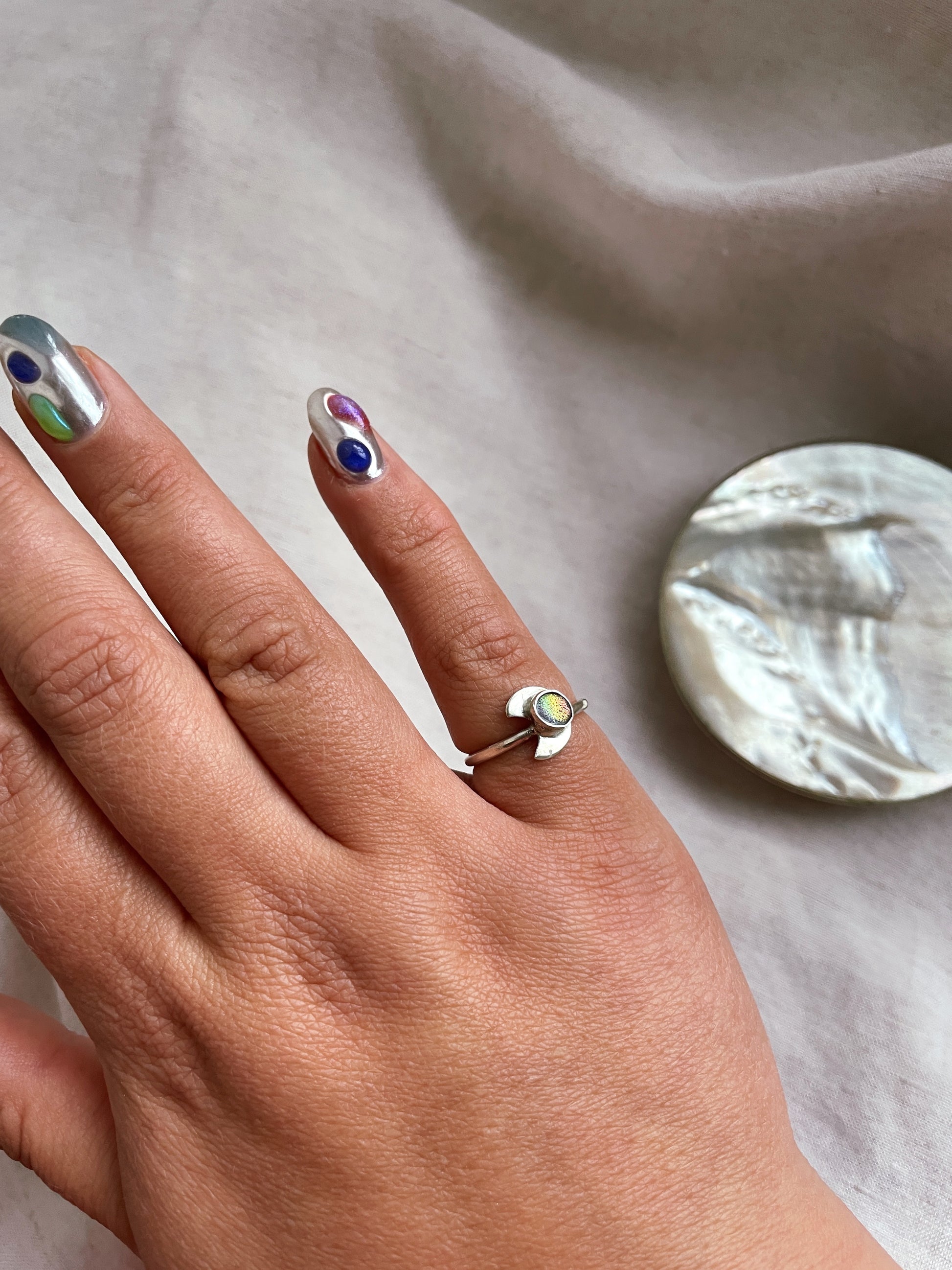 A one of a kind, sterling silver ring made with a beautiful glass gem that shines all different colours in the light. Completely handmade and due to the nature of the glass no two rings will ever with the same. This ring measures as a small size L.