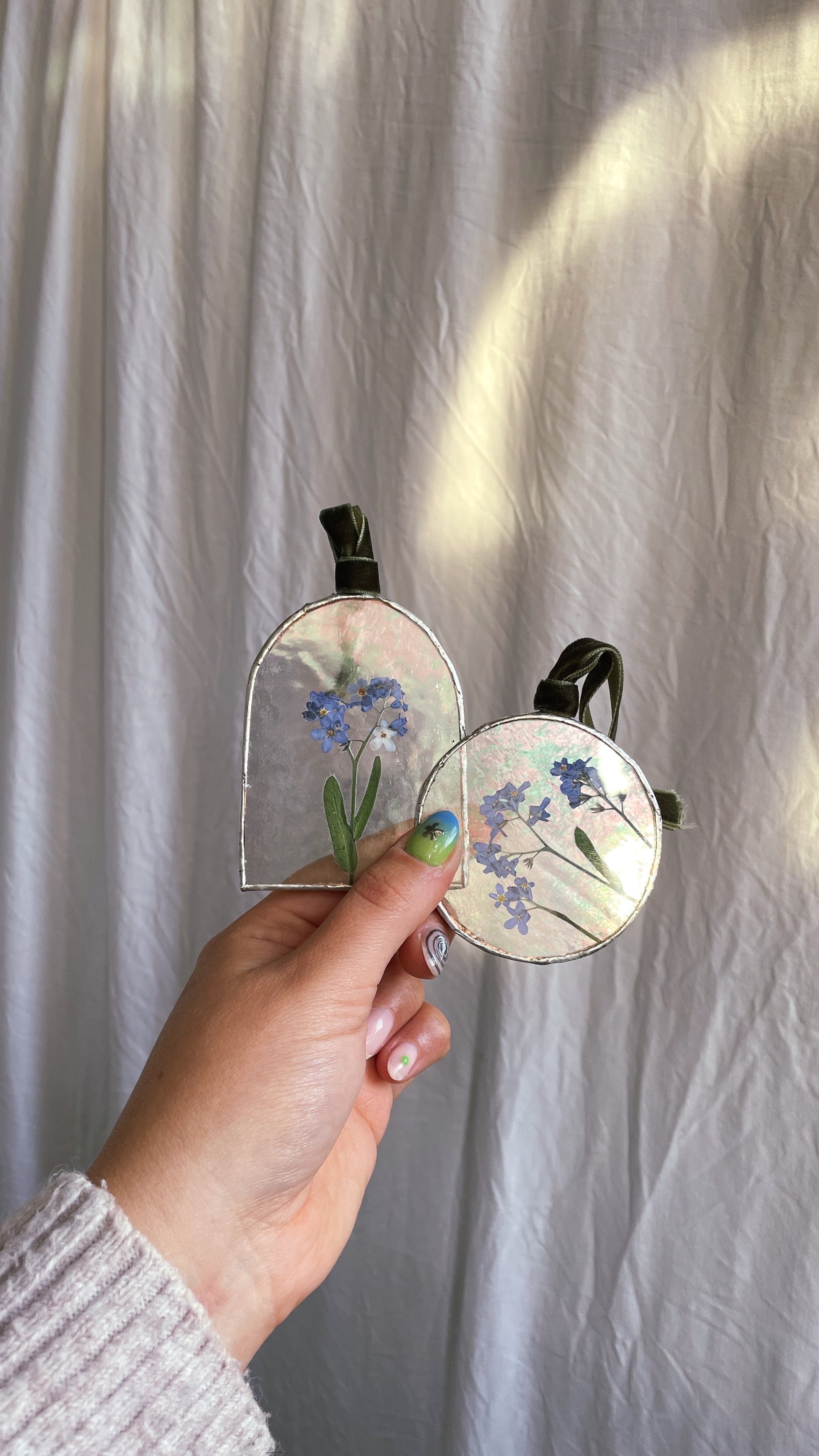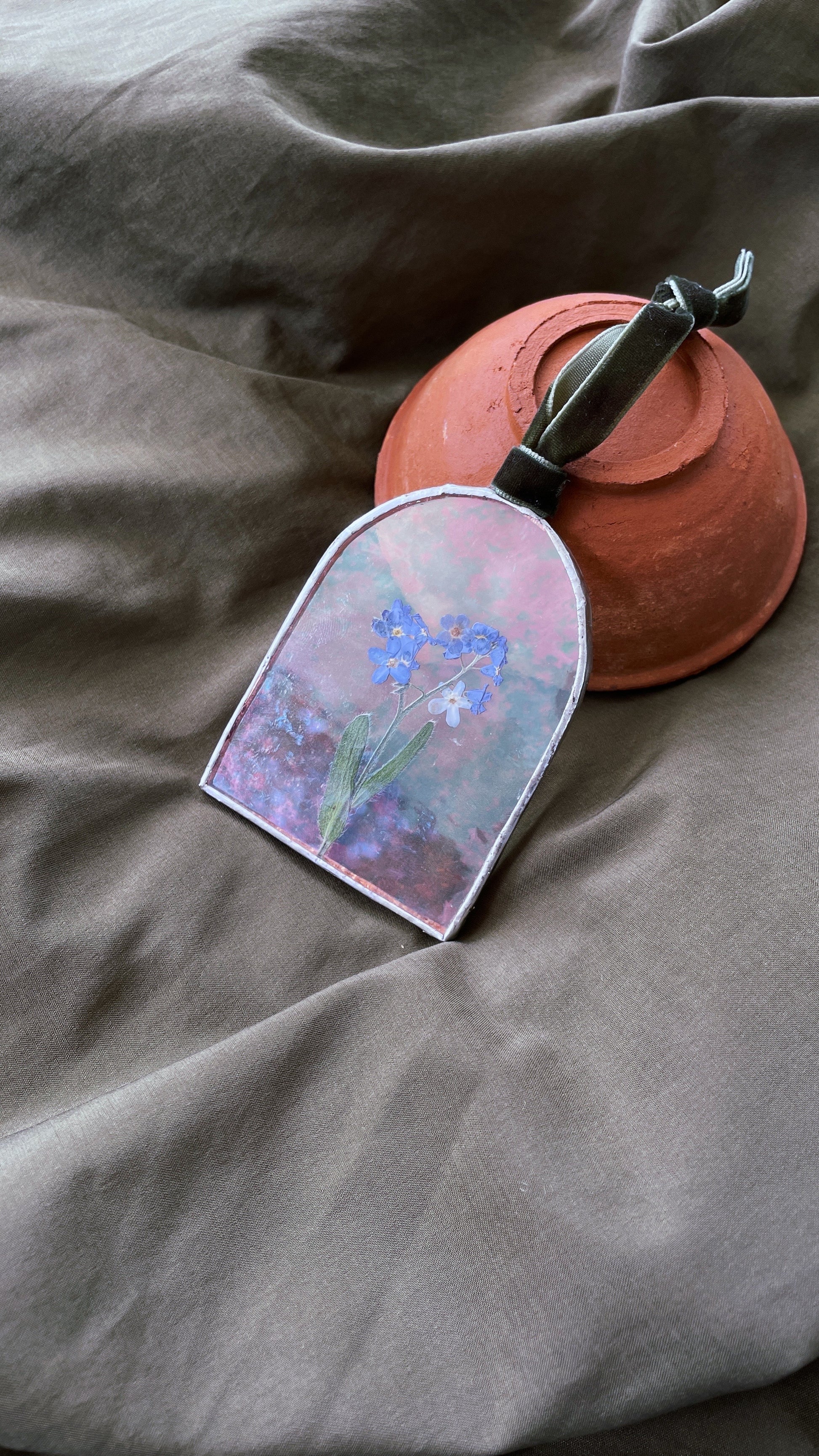 A simple, iridescent glass arch frame, containing pressed Forget me Not flowers. Made using the traditional techniques of Tiffany Stained Glass. Comes on green velvet ribbon to hang from.
