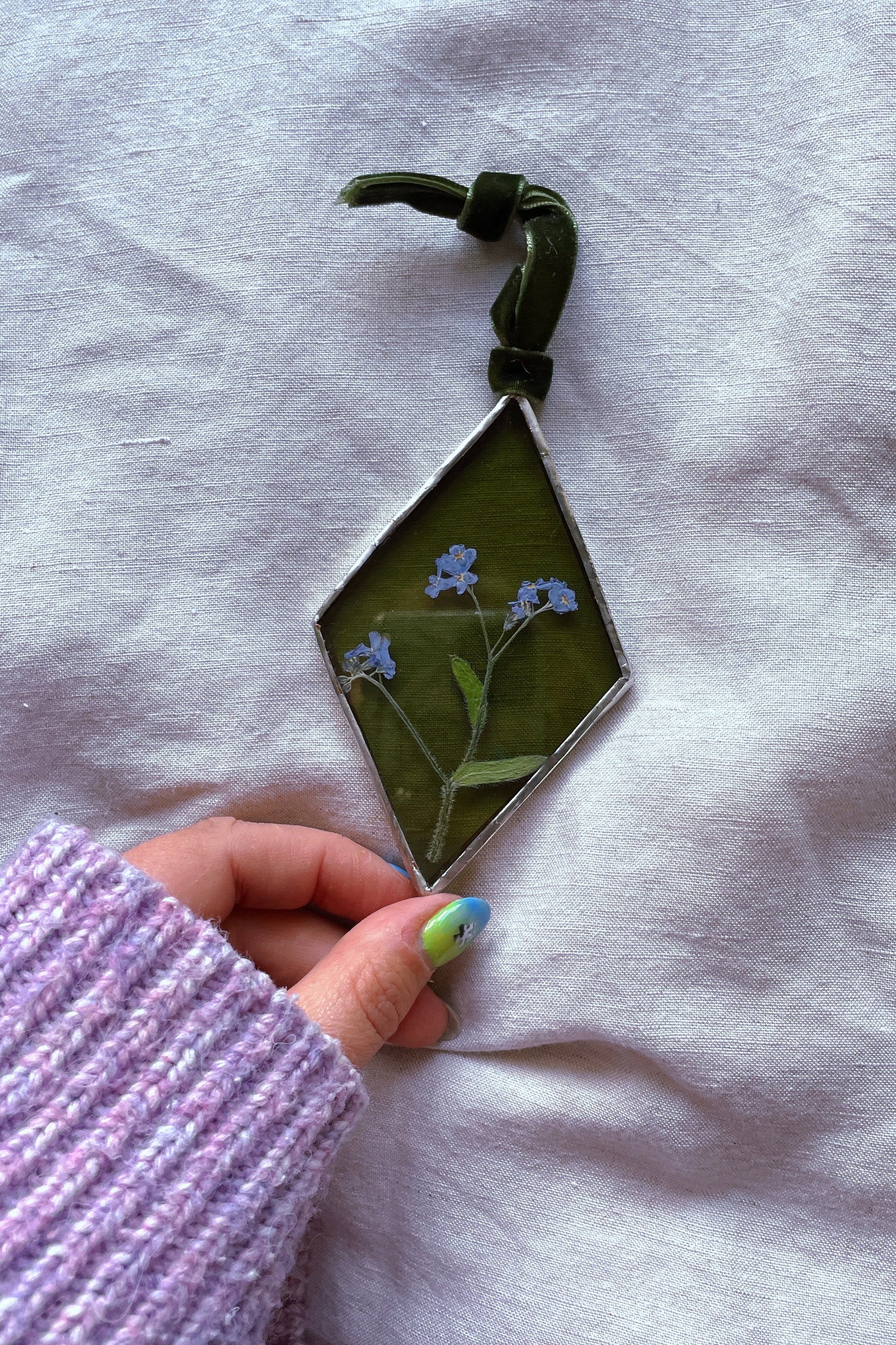 Forget me Not frame with a muted green glass. This piece can be displayed from the green velvet ribbon.