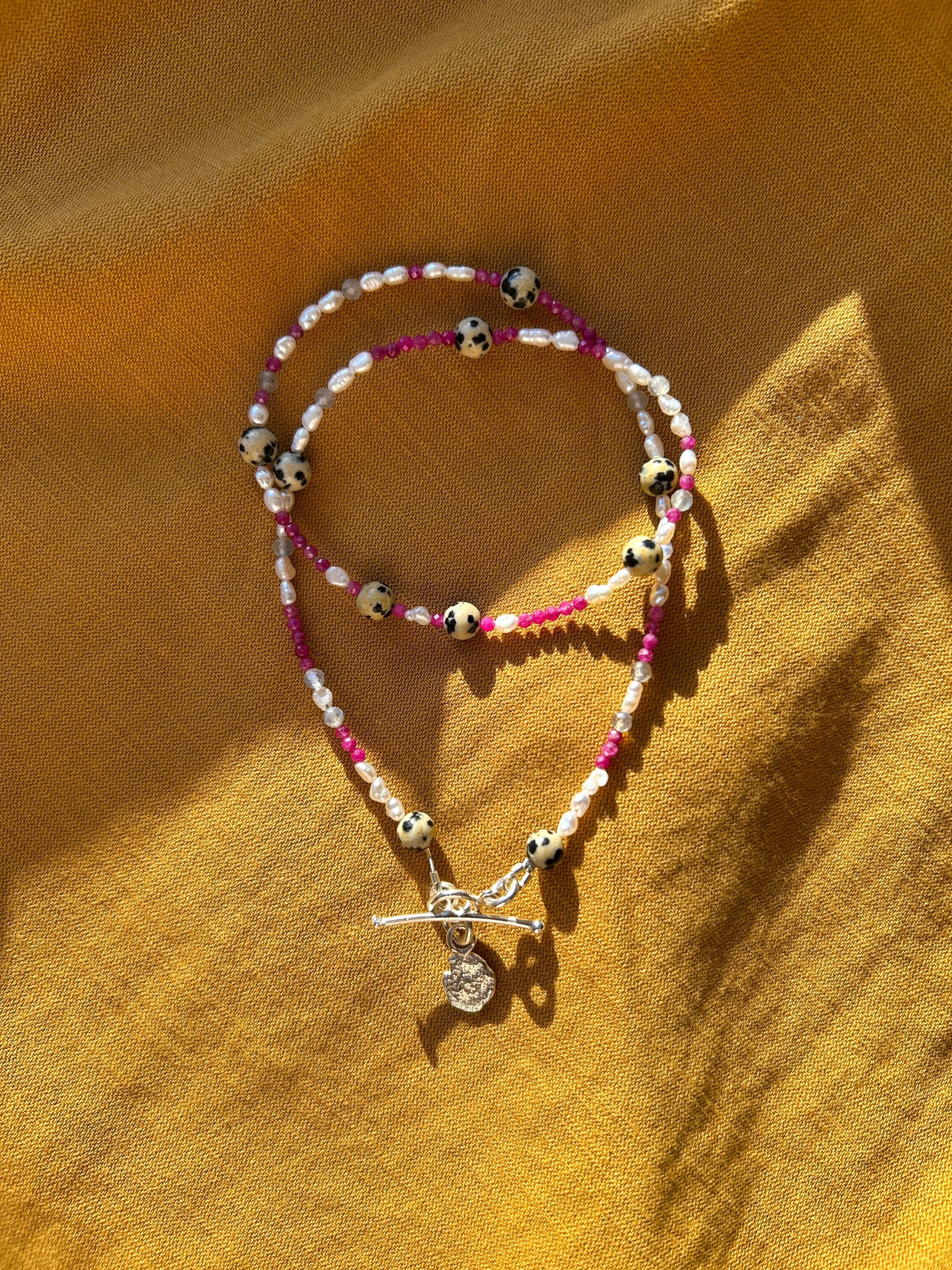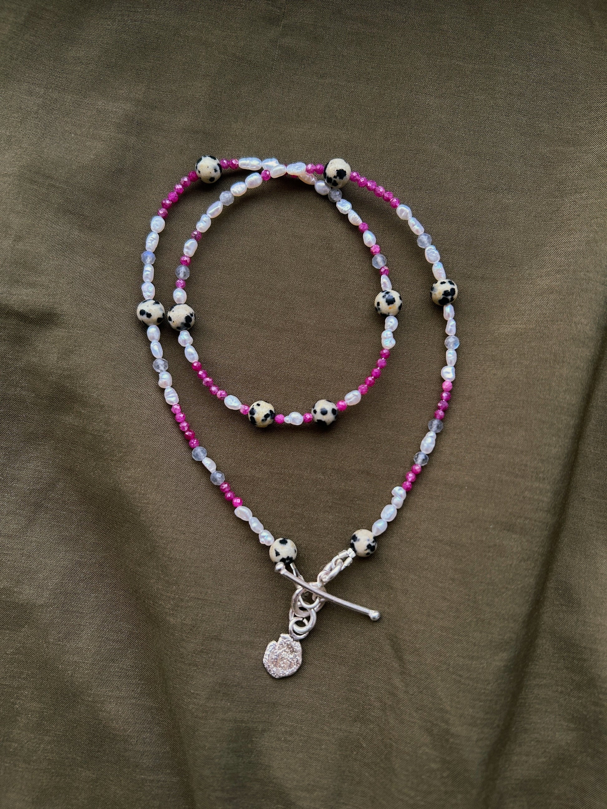 A beautiful one off beaded necklace made with semi precious stone beads, real pearls and sterling silver.