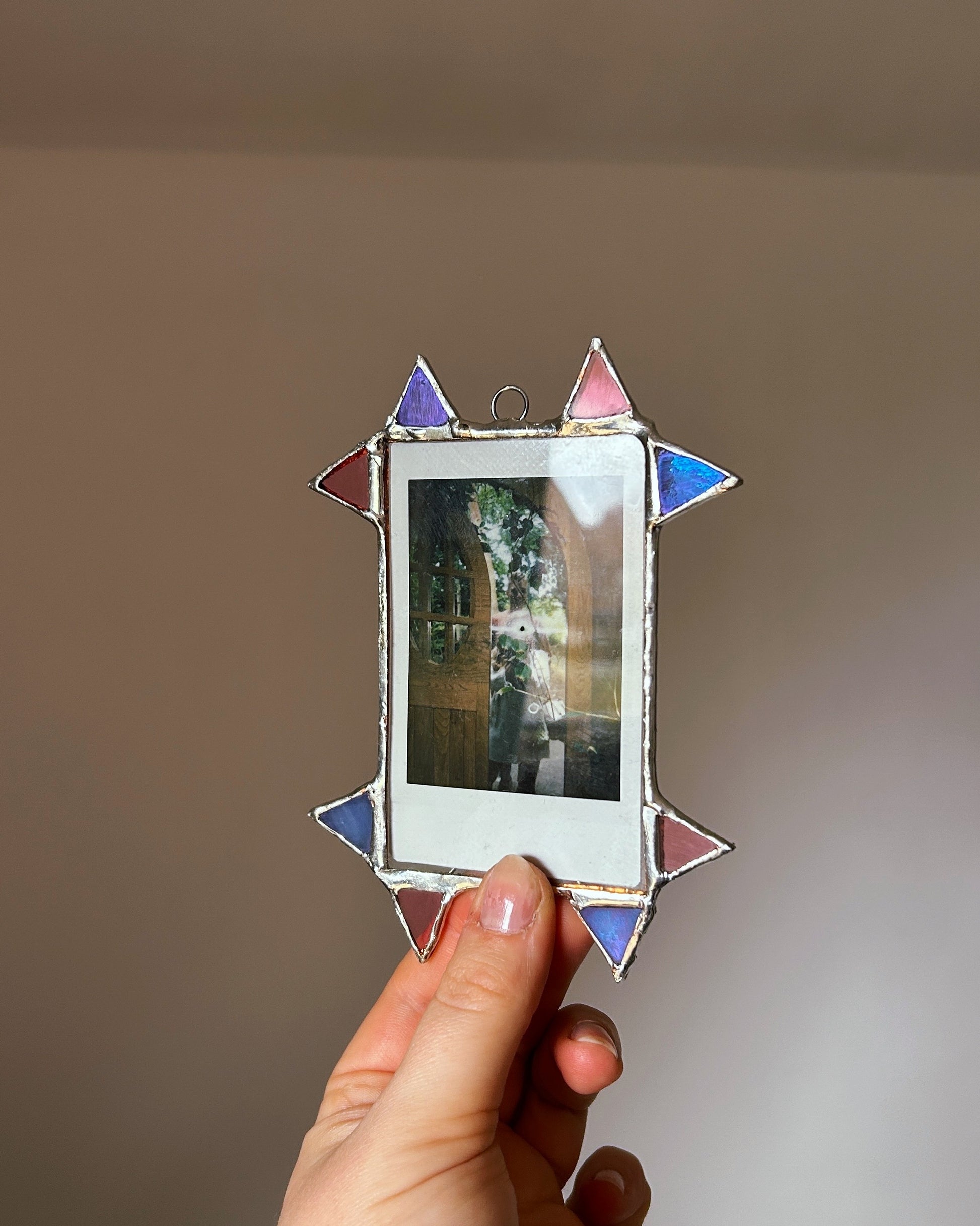 A handmade, stained glass photo frame. This frame has been made to fit the Instax Mini Film but also could be used for a small art print!