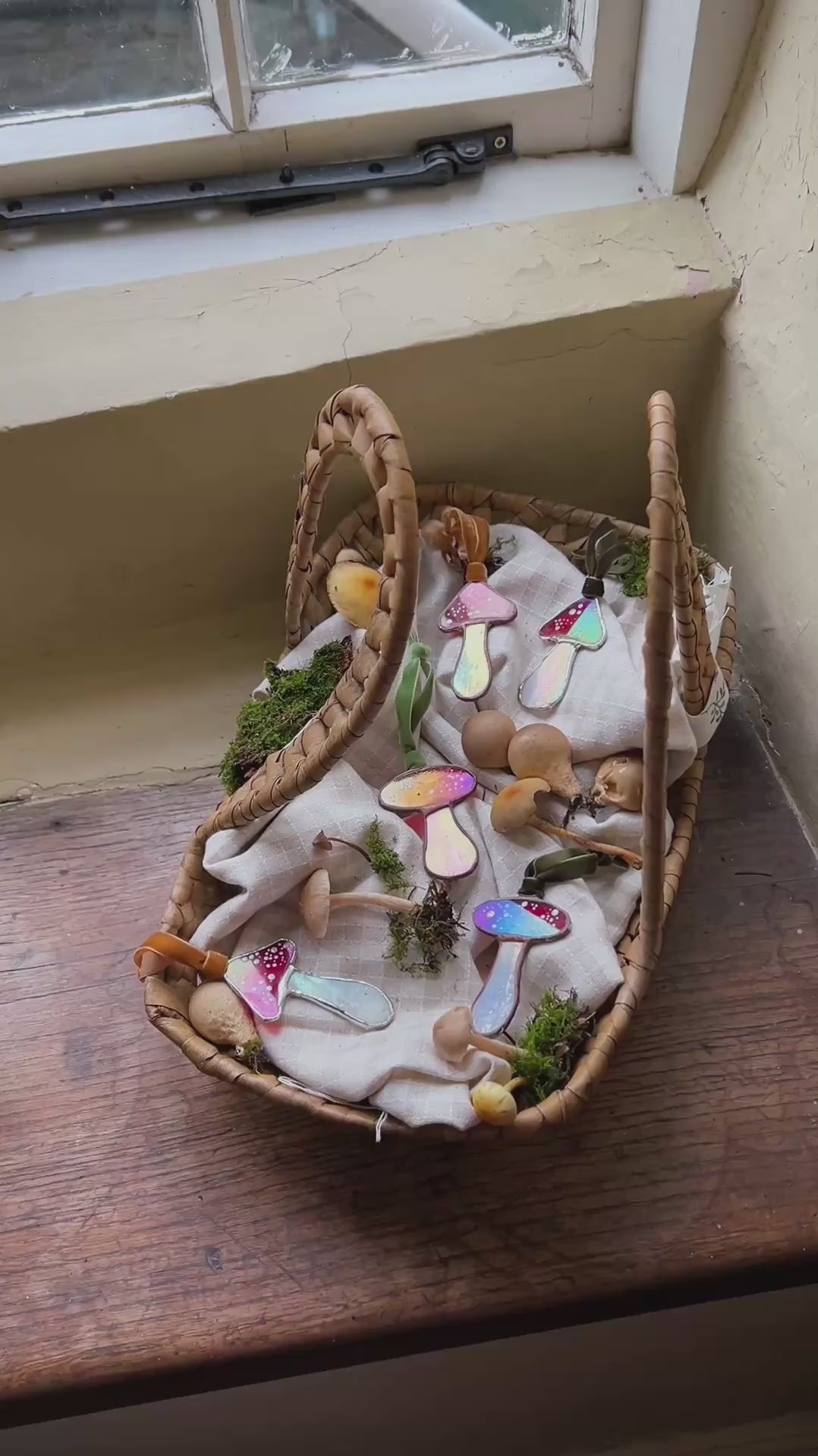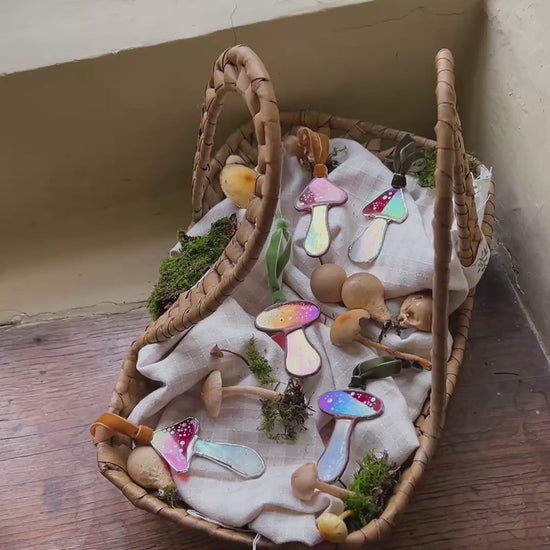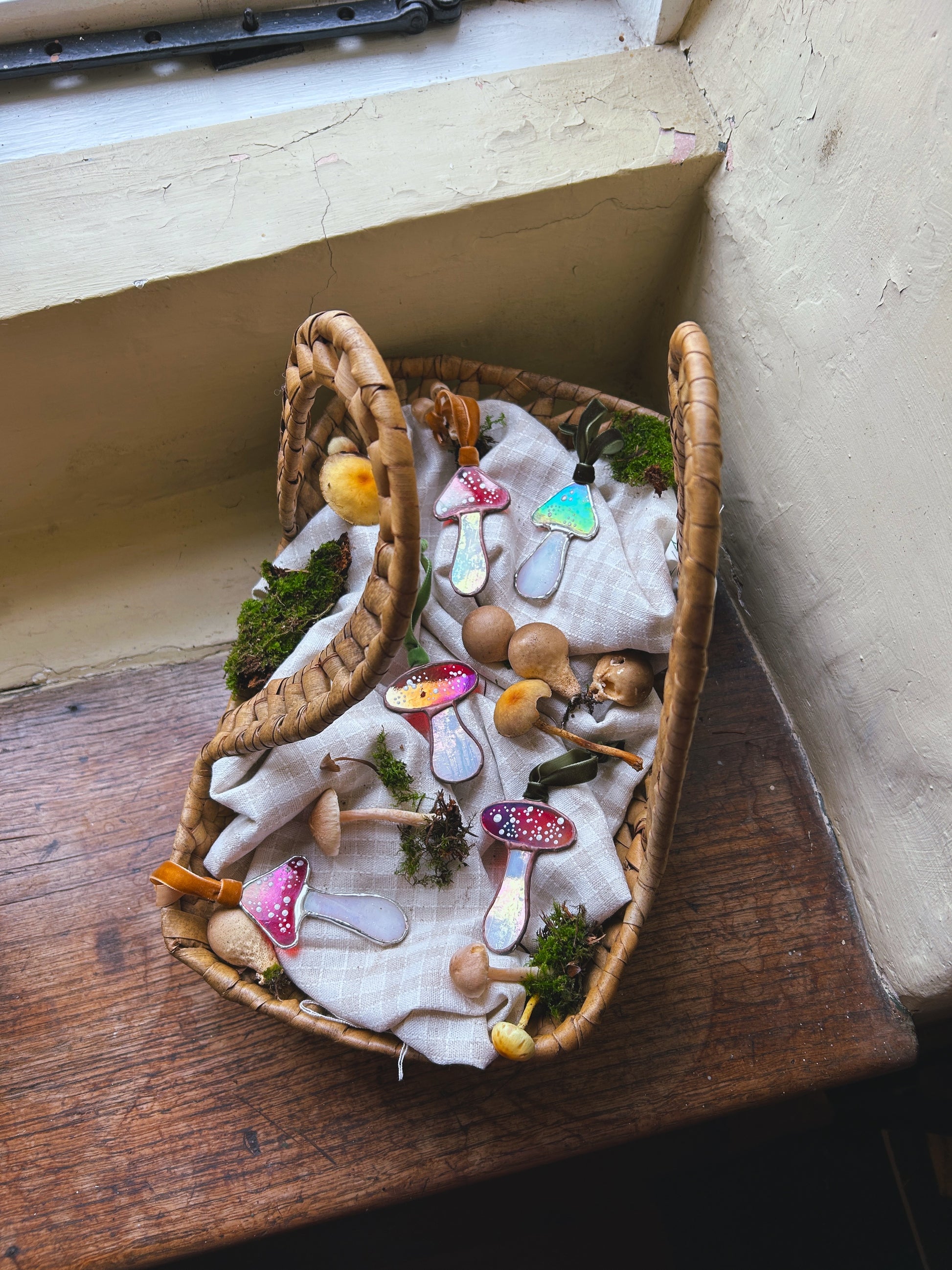 A unique mushroom hanging from velvet ribbon. Finished with hand painted pearlescent dots.