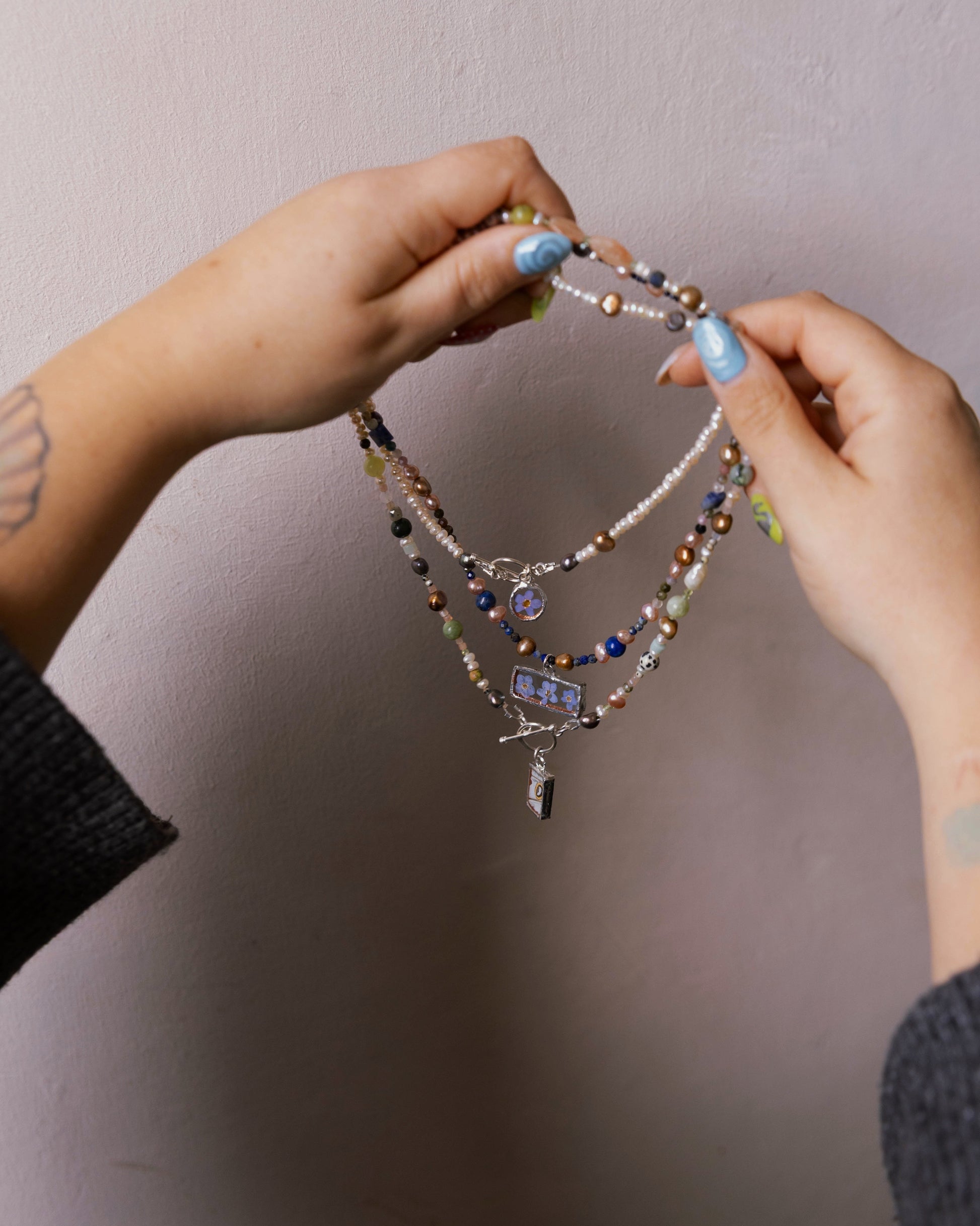 A beautiful one off 17’’ beaded necklace made with semi precious stone beads Jade, Tourmaline, real pearls and sterling silver.