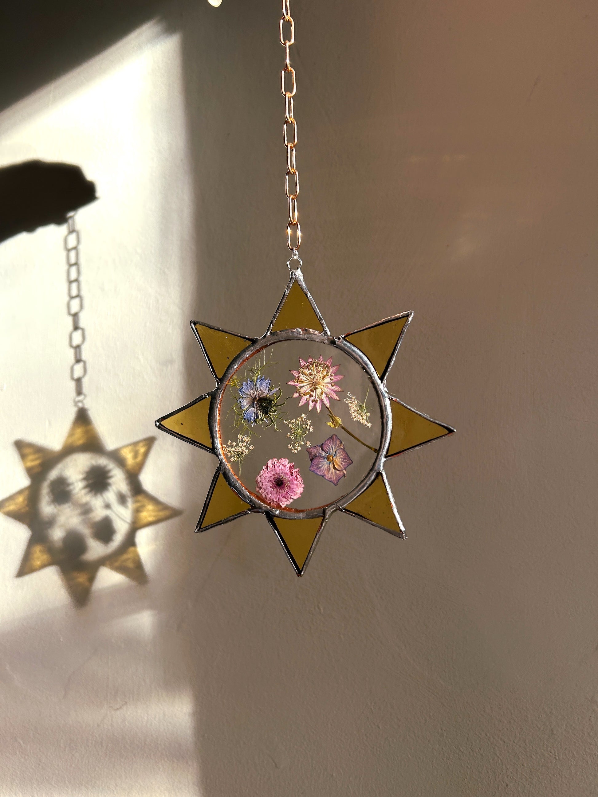 A unique stained glass sun made with a yellow glass and various summer flowers.