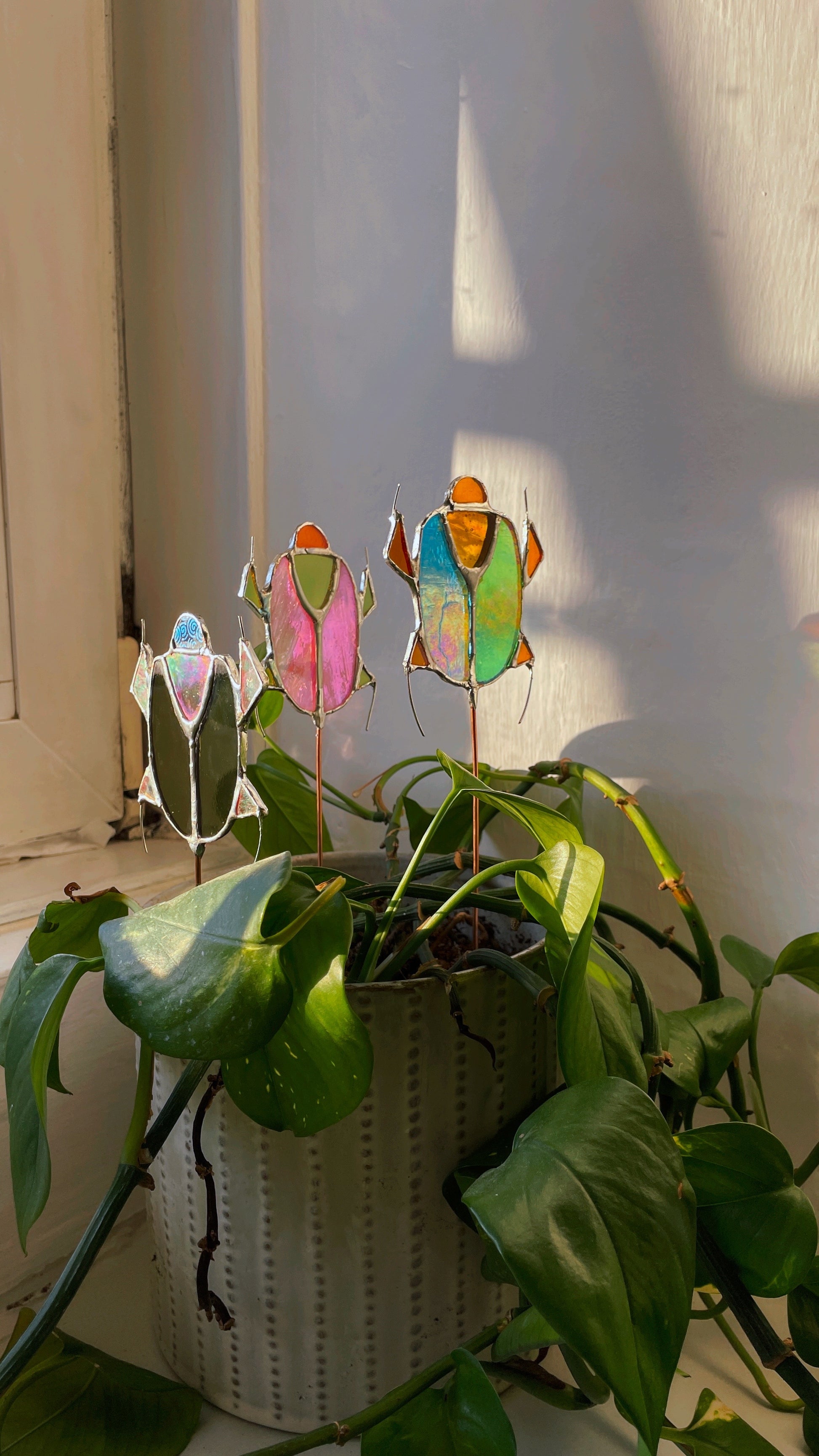 Handmade with iridescent glass. The details are fragile so best suited for indoor use. When placing the stake into soil only hold at the base not the stained glass*