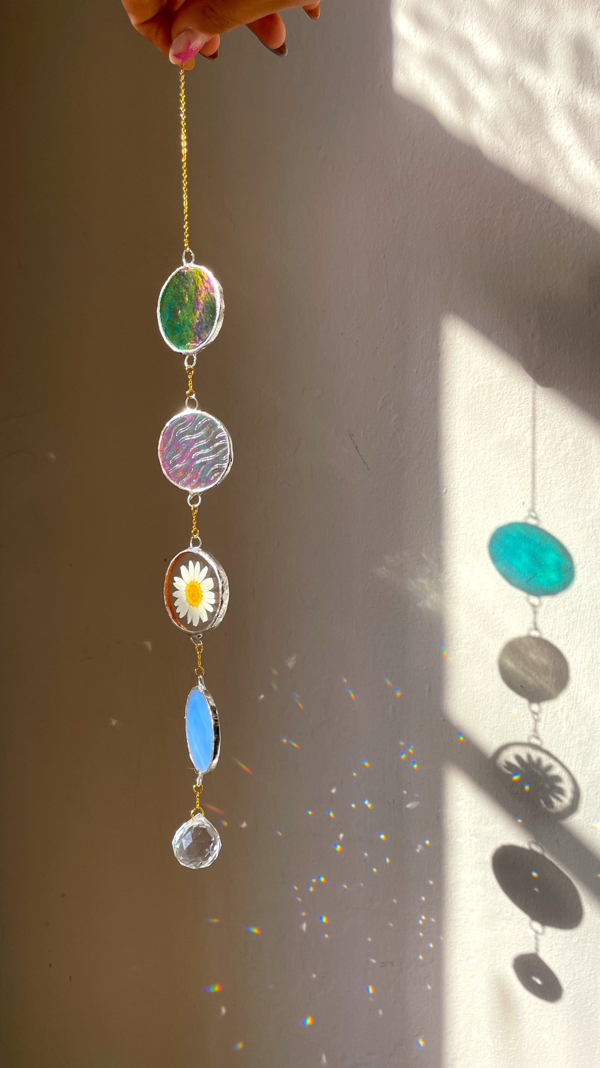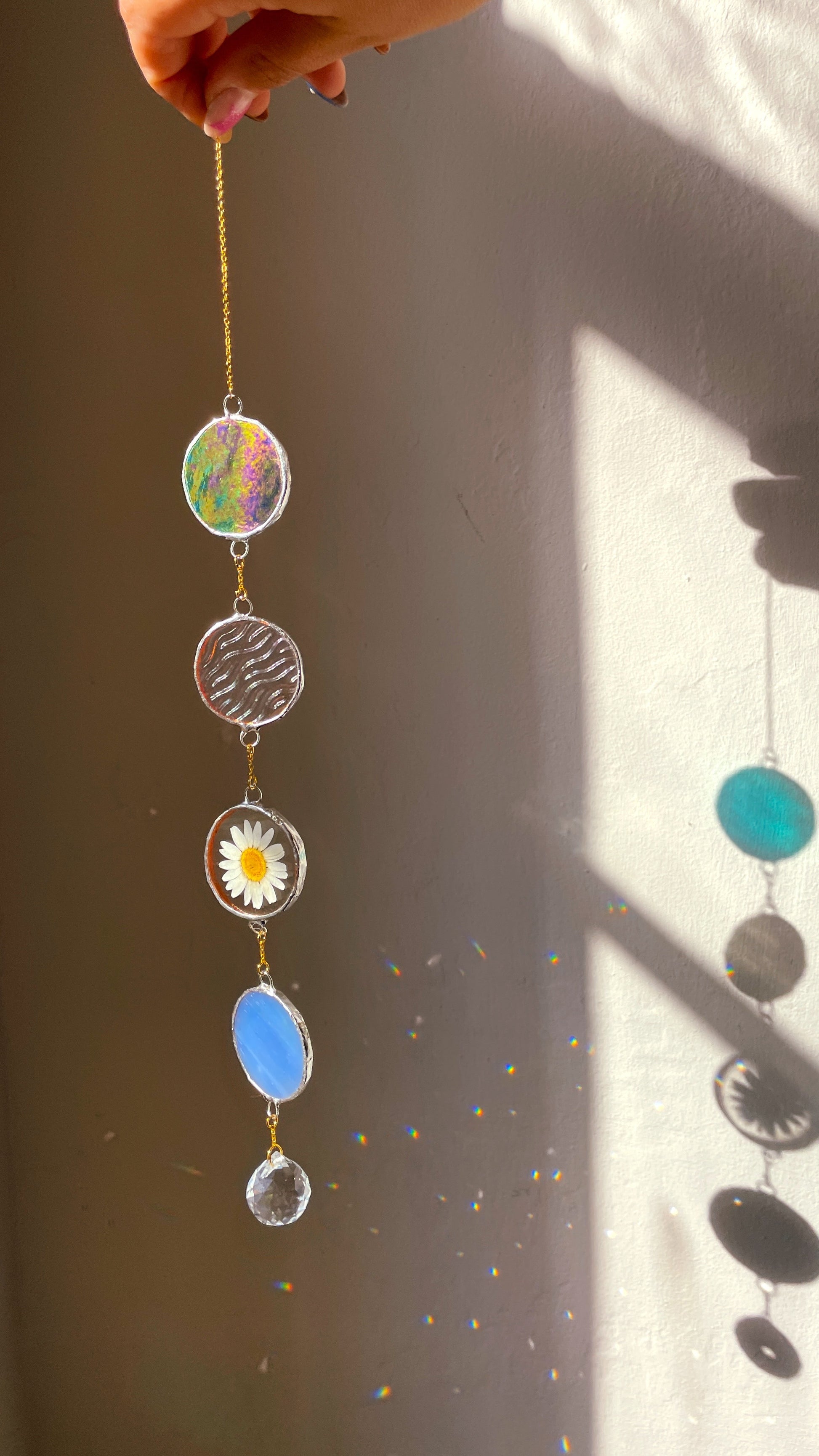 Circle Stained glass mobile. Has a glass prism that hangs from the bottom creating rainbows when the it catches the sunlight. A perfect way to brighten up any window.