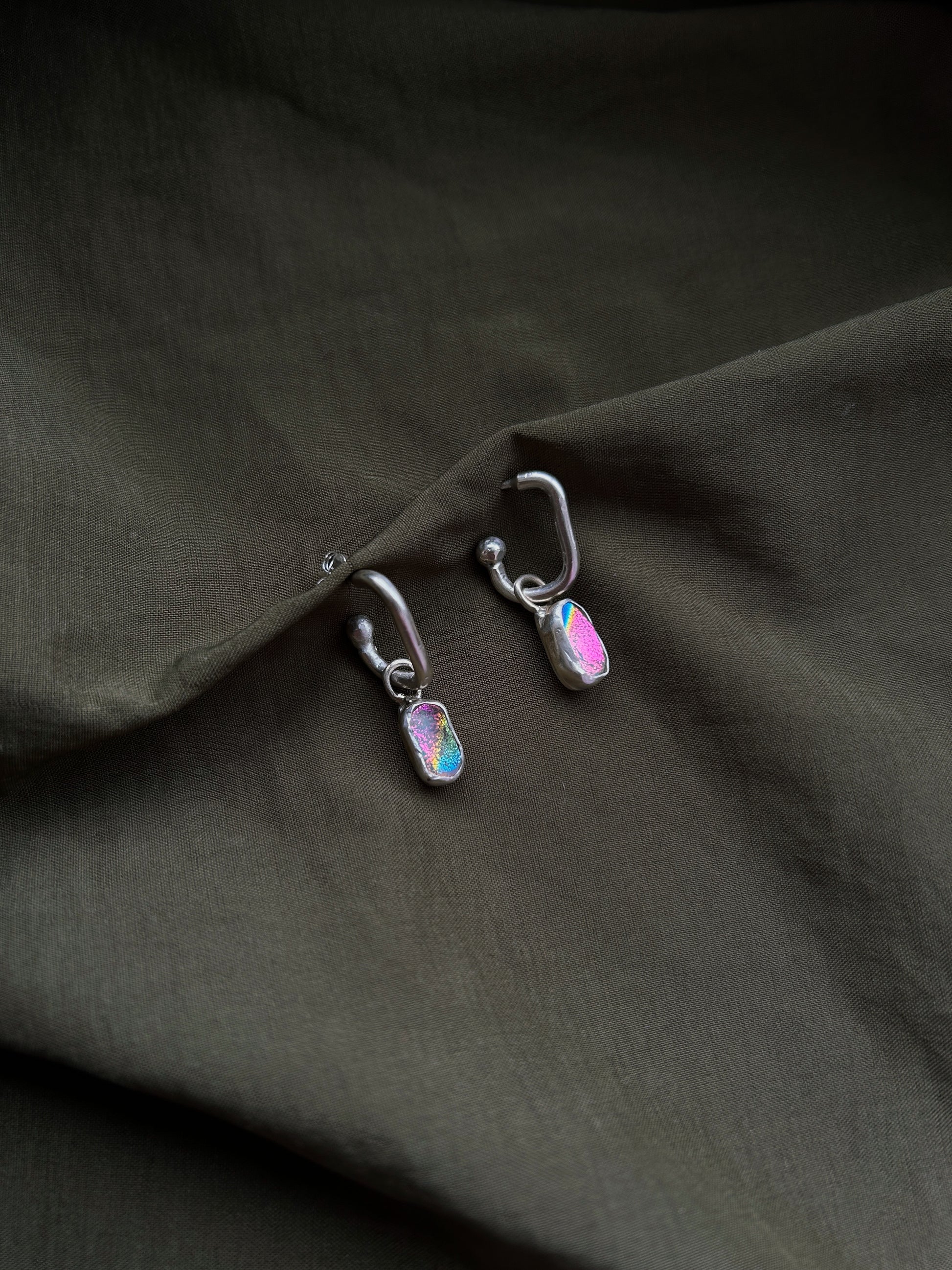 A pair of sterling silver handmade earrings with little iridescent drops and butterfly backs. The hoops have thick ends so the charms stay safely on whilst being worn.