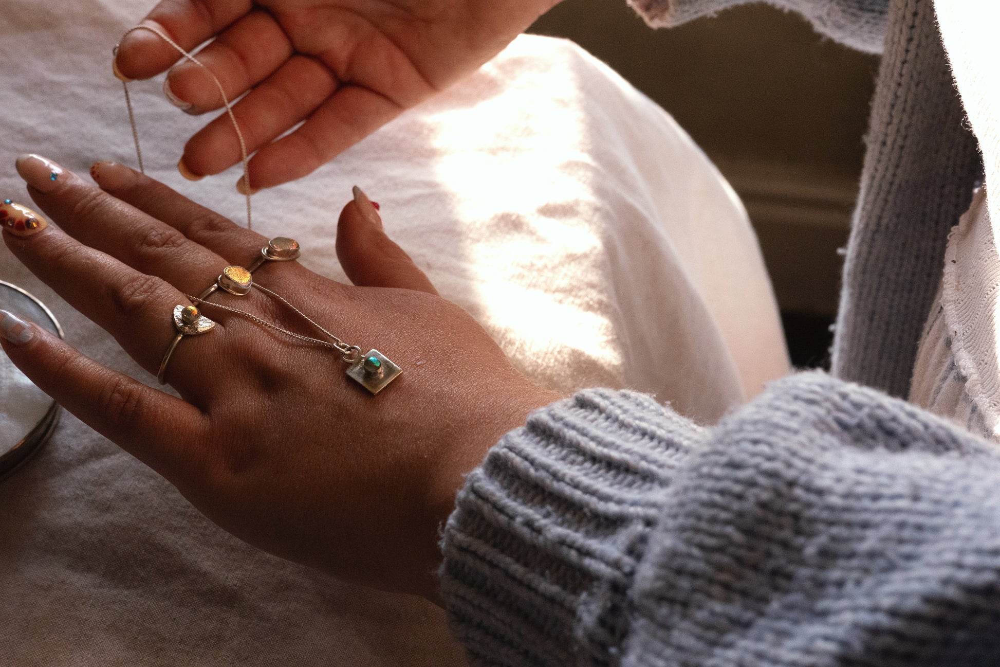 A beautifully, handmade one of a kind sterling silver pendant with a iridescent glass gem. Comes on a sterling silver chain.